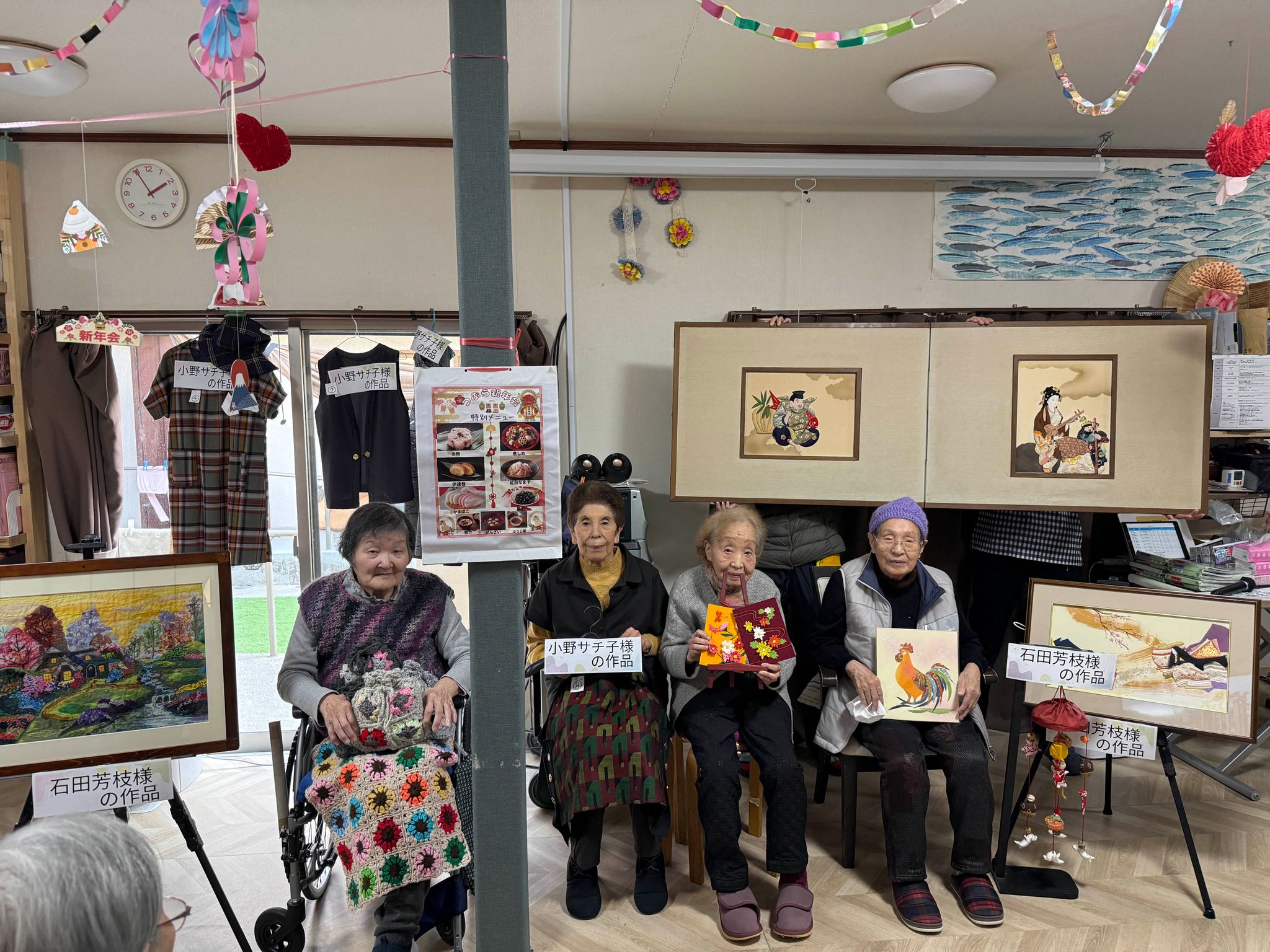利用者様にはチームで協力して福笑いに挑戦して頂いたり、手芸部の方の作品展とインタビューをさせて頂いたり手作りおみくじを引いてもらったり…❤